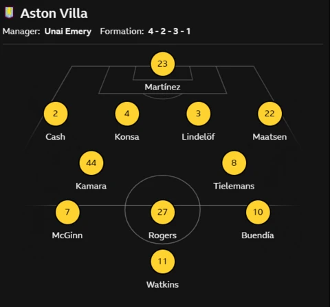 Aston Villa XI: Martínez, Cash, Konsa, Lindelof, Maatsen, Kamara, Tielemans, McGinn, Rogers, Buendía, Watkins.