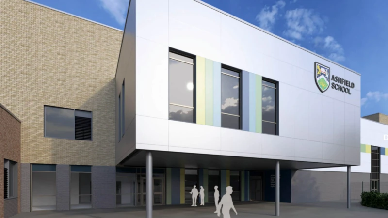 Two Counties Trust ha presentado planes para demoler nueve edificios en el campus de la Escuela Ashfield de 2.750 plazas para dar lugar a tres nuevos bloques escolares, que estarán conectados por puentes.